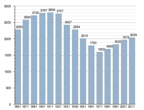 في سنة 1861 بلغ عدد السكان 2٬283 نسمة، وتطور العدد ليصل في سنة 2011 لـ 2٬039 نسمة.