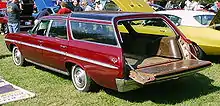 - بوابات ثنائية وثلاثية التشغيل: قدمت شركة فورد سيارات واغن كبيرة الحجم لعام 1966 نظامًا تم تسويقه على أنه "البوابة السحرية"؛ وهو باب تقليدي بزجاج خلفي قابل للسحب، حيث يمكن طي الباب الخلفي أو فتحه على محور على مفصل جانبي مع سحب النافذة الخلفية في أي حالة. قام المنافسون بتسويق إصداراتهم أسقط وحرك (Drop and Swing) أو بوابة حركة ثنائية (Dual Action Tailgate).[3] بالنسبة لعام 1969، دمجت شركة فورد تصميمًا يسمح بإبقاء الزجاج الخلفي في الأعلى أو الأسفل أثناء فتح الباب على جانب المفصل؛ تسويق النظام الذي تمت هندسته بواسطة Donald N. Frey (دونالد ن فيري)[27] "كبوابة سحرية ثلاثية الاتجاه". أصبحت التكوينات المشابهة قياسية على سيارات واغن كبير الحجم والمتوسطة من GM وفورد وكرايسلر. أضافت GM ثقبًا في المضخة الخلفية التي تعمل كلوحة خطوة، لملء الفجوة، جزء صغير للمضخة تم إرفاقه ببوابة الباب. عند فتح الباب كباب متأرجح، يتحرك هذا الجزء من المضخة، ليسمح للجزء المنخفض في المضخة لتزويد الخطوة للدخول السهل؛ عند فتح البوابة أو رفعها لموضع مغلق، يظل قسم الكروم في مكانه مما يصنع المضخة "بالكامل".
