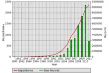 خريطة نمو سجل مستودعات الوصول الحر للمستودعات والمحتويات، 1 أغسطس 2011