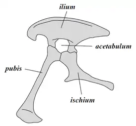 تتميز الديناصورات السحلية الورك تقليديًا عن الديناصورات الطيرية الورك من خلال تركيبة حوضها الثلاثي تشعبات، بعظم العانة المتجه إلى الأمام. بينما عند طيريات الورك يكون في الخلف، موازي عظم الإسك. وسبب التسمية بسحليات الورك لأن أسلافها من السحالي الحديثة والزواحف الأخرى احتفظت بنفس التشريح للورك. وسبب تسمية ديناصورات طيرية الورك بذلك لأنها مشابه لتركيبة ورك الطيور، رغم أنه لم تقترح أي علاقة محددة بين الطيور وطيريات الورك.