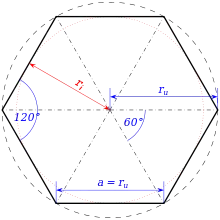 - نصف قطر الدائرة المحيطة بالسداسي تساوي طول ضلعه، أي بفرض طول الضلع a: