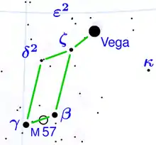 يقع م57 في كوكبة القيثارة Lyra جنوب أسطع نجم فيها المسمى Vega.