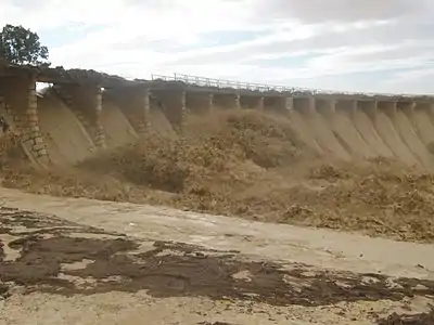 - سعة التخزين 3 ملايين متر مكعب من مياه الجريان السطحى وبه فتحات مقاس 1x1 متر أسفلها منسوب ا30 متر فوق سطح البحر ومركب عليها بوابات بأوناش تتحم في قفلها وفتحها عند اللزوم والغرض من هذه الفتحات هو كسح الطمى الراسب امام السد وكذا تستعمل للتهوية للمياه المحجوزة اما م السد.[1]