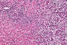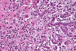 ![]() صورة مجهرية لسرطانة الأقنية الصفراوية داخل الكبد (يمين) بالقرب من خلايًا كبدية طبيعية (يسار). (باستعمال صبغة الهيماتوكسيلين واليوزين) صورة مجهرية لسرطانة الأقنية الصفراوية داخل الكبد (يمين) بالقرب من خلايًا كبدية طبيعية (يسار). (باستعمال صبغة الهيماتوكسيلين واليوزين) | |