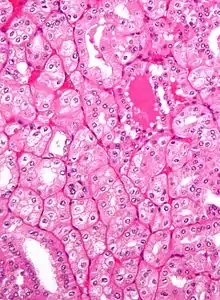 ![]() يتكون سرطان الخلايا الكلوية الكارهة للألوان من خلايا سرطانية لها سيتوبلازم يوزيني وفير (خلايا شاحبة، وخلايا يوزينية مع هالة حول النواة)، ويُظهر أساسا تركيبا صلبا. |