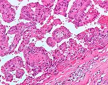 ![]() يتكون النوع الأول من سرطان الخلايا الكلوية الحليمية من حليمات مغطاة بطبقة واحدة أو طبقتين من خلايا مكعبة صغيرة مع قليل من السيتوبلازم، ويتكون النوع الثاني من حليمات مغطاة بخلايا يوزينية كبيرة مرتبة بطريقة غير منتظمة. |