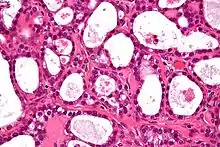صورة مجهرية لسرطانة المبيض ذات الخلايا الصافية بصبغة الهيماتوكسيلين والأيوزين
