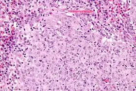 عن طريق فحص نسيج الورم باستخدام عينة، تظهر تحت الميكروسكوب بسيتوبلازم يشبه الزجاج مليء برشيح لمفي من الخلايا الحمضية (خلية حمضية) وكثيرة الانقسام الميتوزي، وباستخدام صبغة شيفحمض البيروديك [الإنجليزية] يظهر الغشاء الخلوي.[4]