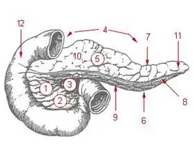 ![]() رسم تخطيطي يظهر موقع البنكرياس رسم تخطيطي يظهر موقع البنكرياس | |