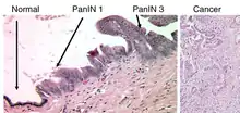 - النوع الأول هو الأورام داخل ظهارة البنكرياس، تُعد هذه الآفات تشوهات مجهرية في البنكرياس وغالبًا ما توجد في تشريح الجثث للأشخاص الذين لم يتم تشخيص إصابتهم بالسرطان، قد تتطور هذه الآفات من الدرجة المنخفضة إلى الدرجة العالية ثم إلى الورم، أكثر من 90% من الحالات في جميع المراحل تحمل جين KRAS خاطئ، بينما تحمل المرحلتين 2 و 3 تلفًا لثلاثة جينات أخرى: CDKN2A (بي16) و بي53 و SMAD4 والتي يتم العثور عليها بشكل متزايد.[55]