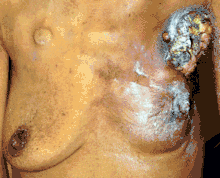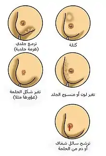 سرطان الثدي هو نوع من أنواع السرطان يظهر في أنسجة الثدي.[3] من علاماته تغير في شكل الثدي، وظهور كتلة في الثدي، تقشير الجلد، سائل قادم من الحلمة، حلمة مقلوبة حديثًا، أو بقع حمراء أو متقشرة.[4] في حالة انتشار المرض في الجسم تظهر العلامات التالية:آلام العظم، انتفاخ في الغدد الليمفية، ضيق في التنفس أو اصفرار في الجلد.[5]
