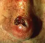 | سرطان الخلايا الحرشفية | من الشائع أن يظهر أحمر اللون، مُجَلَّب؛ أيْ مكسيٌّ بقشرة جافة صفراء اللون، أو لطخة متقشرة، أو نتوء أو تحدب. غالباً ما يكون ورم سريع النمو. | ![]() |