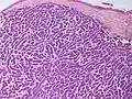 صورة مجهريّة لسرطان الخلايا القاعديّة تظهر الصّفات النّسيجيّة المميّزة (التّطويق المحيطي، سَدى مخاطيّة و (artefactual clefting باستخدام صبغة .H&E تتمايز الخلايا المصابة بسرطان الخلايا القاعديّة إلى خلايا جُرَيْبيّة، مُفْترَزة ودُهنيّة وتكوّن ما يسمّى بال trichoblast, وبالتّالي يصعب التّمييز بين هذا المرض وما يسمّى بالtrichoblastic carcinoma ؛ و هو مرض نادر وخبيث.[8] عدّ بعض العلماء سرطان الخلايا القاعديّة من أنواع ال trichoblastic carcinoma، ولكن لم يُتّفق على هذا التّصنيف إلى الآن.[9] ويُسبّب التّعرض المفرط لأشعّة الشّمس ما يسمّى بمَثْنَوي الثّايمين؛ شكل من أشكال تلف الحمض النّووي ينتج عن تكوّن روابط من نوع ثايمين-ثايمين. ويقوم الجسم عادةً بإصلاح ما يتلف من الحمض النّووي نتيجة التّعرض للأشعّة فوق البنفسجيّة، لكن لا تقوم طرق الإصلاح المختلفة بإزالة جميع الرّوابط التي تكونّت وسبّبت التّلف (مَثْنوي الثّايمين). يؤدّي تراكم التّلف إلى حدوث الطّفرة. وبصرف النّظر عن الطّفرات، التّعرض المفرط لأشعّة الشّمس يثبّط جهاز المناعة في الجسم ونتيجة لذلك فإنّ ذلك قد يقلّل من الرّقابة المناعيّة على الخلايا السّرطانيّة الجديدة. يمكن أن يتطوّر سرطان الخلايا القاعديّة نتيجة الإصابة بمتلازمة وحمة الخلايا القاعديّة (متلازمة غورلين)، وتمتاز هذه المتلازمة بتكلّس مِنْجل المُخ الذي يقع في منتصف الدماغ، تشوّه الأضلاع، إصابة الفك بأورام حميدة سنية المنشأ تسمّى keratocystic odontogenic tumors وظهور وَهْدات (انخفاضات طفيفة في الجلد) في راحة اليد وباطن القدم. وجود طفرة في جين PTCH1 وهو جين كابت يقع على كروموسوم رقم 9 وبالتّحديد على الموقع 9q22.3 و الذي يؤدّي إلى تثبيط ما يسمّى ب hedgehog signaling pathway والذي بدوره يؤدّي إلى الإصابة بالمتلازمة. ويمكن أن يصاب الإنسان بهذا السّرطان أيضاً في حال حدوث طفرة في جين SMO والذي يقوم أيضاً بتثبيط طريق الهيديهوج للإرسال hedgehog signaling pathway.[10]