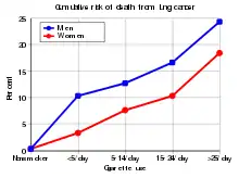 هذا الخطر أقلّ من ذلك بكثير عند غير المدخّنين : 1,3 ٪ عند الرجال و1،4 ٪ عند النساء.[9][25]