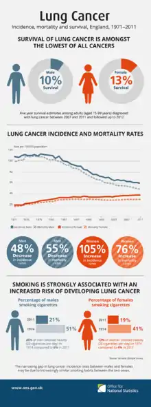 |CitationClass=تم تجاهله (مساعدة) - "Lung cancer statistics". Cancer Research UK. مؤرشف من الأصل في 12 مايو 2015. اطلع عليه بتاريخ 20 ديسمبر 2016. الوسيط