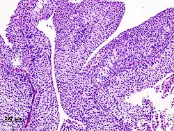 ![]() التشريح المرضي النسيجي لسرطانة الخلايا الانتقالية في المثانة بخزعة عبر الإحليل وتلوين بالهيماتوكسيلين إيوسين. التشريح المرضي النسيجي لسرطانة الخلايا الانتقالية في المثانة بخزعة عبر الإحليل وتلوين بالهيماتوكسيلين إيوسين. | |