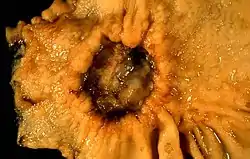 ![]() قرحة معدية مشبوهة تم تشخيصها على أنها سرطان بالخزعة واستئصالها. عينة جراحية بعد الاستئصال. قرحة معدية مشبوهة تم تشخيصها على أنها سرطان بالخزعة واستئصالها. عينة جراحية بعد الاستئصال. | |