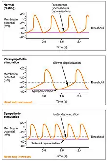 في حين أن العقدة الجيبية الأذينية (SA node) هي المسئولة عن نظم القلب في الظروف العادية، تُنَظَم سرعة القلب من قِبَل مدخلات من الجهاز العصبي الودي والجهاز العصبي اللاودي للعقدة الجيبية الأذينية. يوفر عصب التسريع مدخلات من الجهاز العصبي الودي إلى القلب عن طريق إفراز نورإبينفرين على خلايا العقدة الجيبية الأذينية، ويمد العصب الحائر المدخلات اللاودية للقلب عن طريق إفراز أستيل كولين على خلايا العقدة الجيبية الأذينية. ولذلك، فإن تحفيز عصب التسريع يزيد من معدل ضربات القلب، في حين أن تحفيز العصب الحائر يقلل من سرعة القلب.[9]