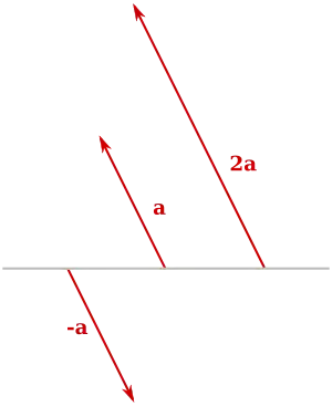تمثل السرعات المتجهة بأسهم تتناسب أطوالها مع مقدار السرعة، ويتخذ اتجاه السهم اتجاه السرعة. انظر الشكل : السرعة a والسرعة المساوية في عكس الاتجاه -a، وضعف السرعة 2a وفي نفس اتجاه السرعة a.