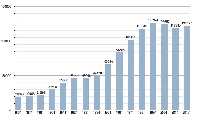 في سنة 1861 بلغ عدد السكان 19٬286 نسمة، وتطور العدد ليصل في سنة 2017 لـ 121٬627 نسمة.