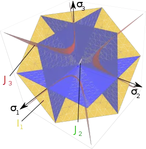 غالباً يعبر سطح الخضوع في علاقات فراغ الإجهاد الرئيسي ثلاثي الأبعاد ، ومتغيرات ثنائية الأبعاد .[2][3]