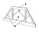 قائم الجملون: 1: قائمتيّ جملون عموديتين، 2: عارضة رابطة، 3: عارضة انحراف، 4: روافد رئيسية. |