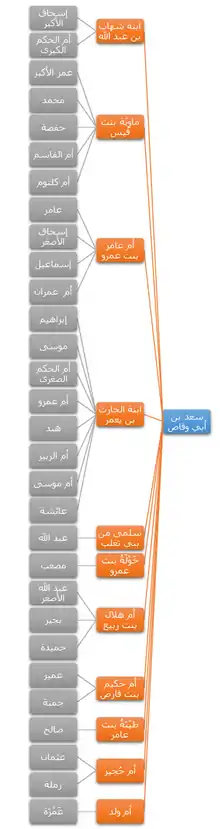 | النسب | أبوه: أَبو وقاص مالك بن وُهَيب بن عبد مناف بن زُهْرة بن كلاب بن مرة بن كعب بن لؤي بن غالب بن فهر بن مالك بن النضر بن كنانة بن خزيمة بن مدركة بن إلياس بن مضر بن نزار بن معد بن عدنان أشقاؤه: عامر بن أبي وقاص، عتبة بن أبي وقاص، عمير بن أبي وقاص زوجاته: ابنة شِهاب بن عبد الله بن الحارث بن زُهْرة، ماوِيّة بنت قَيْس بن مَعْدِيكَرِبَ، أمّ عامر بنت عمرو بن عمرو بن كعب، ابنة الحارث بن يَعْمُرَ بن شراحيل، سلمى من بني تغلب بن وائل، خَوْلَةُ بنت عمرو بن أوس، أمّ هلال بنت ربيع بن مُرَيّ، أمّ حكيم بنت قارض، سَلْمى بنت خَصَفَة بن ثَقْفِ، طيّبَةُ بنت عامر بن عُتْبة، أمّ حُجير أبناؤه الذكور: إسحاق الأكبر، عُمَرُ، محمد، عامر، إسحاق الأَصغر، إسماعيل، إبراهيم، موسى، عبد الله، مصعب، عبد الله الأصغر، بُجَيْر، عُمير، عُمير الأصغر، عمر الأصغر، عمران، صالح، عثمان أبناؤه الإناث:أمّ الحَكَمِ الكبرى، حَفْصَةُ، أمّ القاسم، أمّ كلثوم، أمّ عمران، أمّ الحكم الصغرى، أمّ عمرو، هند، أمّ الزّبير، أمّ موسى، حَميدة، حمنة، أمّ عمرو الصغرى، أمّ أيّوب، أمّ إسحاق، رملة، عمرة، عائشة |
