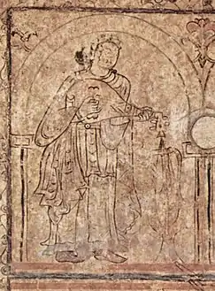 ![]() لوحة جدارية في قصر الحير الغربي في سوريا تُظهر موسيقياً يعزف على آلة العود السوري مشابهة للآلة التي كان يعزف عليها سعيد بن مسجح الذي توفي قبل بناء القصر بفترة قريبة. | |