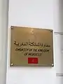 لافتة خارج مبنى السفارة باللغة العربية ولغة إنجليزية مع علم المغرب