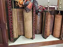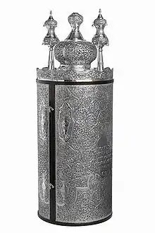 علبة توراة فضية. في بعض التقاليد، سفر التوراة يخزن في علبة خشبية أو معدنية مزينة