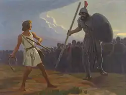 قامت الحرب بين الفلسطيين وبني إسرائيل الذين احتلوا مدينة سوكوة إحدى مدن سبط يهوذا حسب السفر،[57] وأخذ جالوت الذي يستفيض السفر في وصفه بإرهاب بني إسرائيل حتى إن السفر يذكر: الرجل الذي يقتله، يغنيه الملك غنى جزيلاً، ويعطيه ابنته، ويجعل بيت أبيه حرًا في إسرائيل.[58] إثر التحاق داود بالجيش راعه الخوف المسيطر بين قومه من جالوت: من هو هذا الفلسطي الأغلب حتى يعير صفوف الله الحي.[59] ونزل لمبارزته: أنت تأت إلي بسيف وترس، أما أنا فآتي إليك باسم رب الجنود إله إسرائيل.[60] واستطاع الانتصار عليه بالمقلاع والحجارة،[61] يبدو أن هذا الانتصار قد أثر تأثيرًا قويًا على داود فقط نشأت صداقة قوية بينه وبين يوناثان ابن شاول: نفس يوناثان تعلقت بنفس داود وأحبه كنفسه.[62] وحقق له شعبية كبيرة: فأجابت النساء اللاعبات وقلن، ضرب شاول الألوف أما داود عشرات الألوف.[63] وتزوج ميكال ابنة شاول بعد أن قدم مهرها مئتي غلفة من الفلسطيين،[64] والغلفة هي ما يقطع عند الختان، ويرد ذكرها عدة مرات في العهد القديم، إذ إن بني إسرائيل كانوا يتفاخرون بالختان.