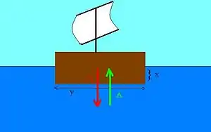 حجم الماء الذي يزيحه القارب يساوي =الطول × العرض × ارتفاع للجزء المغمور هو V=x*y*L (هذا إذا اعتبرنا شكلا بسيطا جدا للسفينة أي مستطيل)