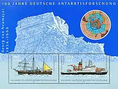 طابع بريد تذكاري „100 عام في البحث العلمي الألماني للمناطق القطبية“ ، من عام 2001 . يسار :[السفينة غاوس , 1901)], يمين : محطمة الجليد بولارشتيرن