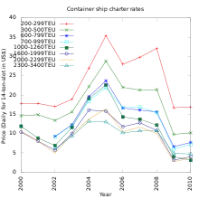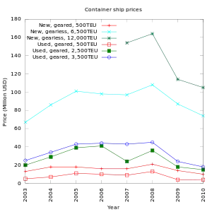 في السنوات الأخيرة، أدى العرض المفرط لسعة سفن الحاويات إلى انخفاض أسعار السفن الجديدة والمستعملة. من عام 2008 م إلى عام 2009 م، انخفضت أسعار سفن الحاويات الجديدة بنسبة 19 إلى 33٪، بينما انخفضت أسعار سفن الحاويات القديمة بنسبة 47 إلى 69٪.[54] في مارس 2010، كان متوسط السعر لسفينة حاويات سعة 500 حاوية مكافئة 10 ملايين دولار، في حين بلغ متوسط أسعار السفن التي لا تحتوي على تروس والتي يبلغ حجمها 6500 و12 000 حاوية نمطية 74 مليون دولار و105 مليون دولار على التوالي.[55] في الوقت نفسه، بلغ متوسط الأسعار المستعملة لسفن الحاويات الموجهة التي يبلغ عمرها 10 سنوات والتي تبلغ طاقتها 500 و2500 و3 500 حاوية مكافئة 4 ملايين دولار و15 مليون دولار و18 مليون دولار على التوالي.[56]