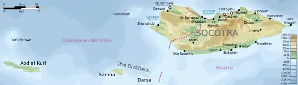| الجزر الرئيسية | سقطرى، عبد الكوري، سمحة، درسة، جزيرة صيال عبد الكوري، جزيرة صيال سقطرى |