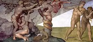واختار ميكيلانجلو مشاهدا من الإنجيل ونظمها في فريسكو يغطي ظل سقف الكنيسة ، ومن ضمنها لوحة خلق آدم الشهيرة و آدم وحواء والشجرة ، أما لوحة الحساب الأخير في مرسومة على أحد الجدران.[2][3]