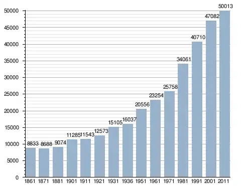 في سنة 1861 بلغ عدد السكان 8٬833 نسمة، وتطور العدد ليصل في سنة 2011 لـ 50٬013 نسمة.