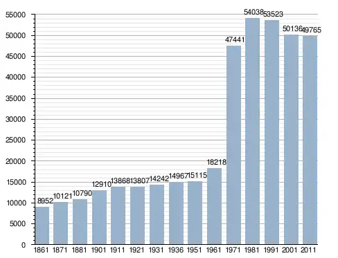 في سنة 1861 بلغ عدد السكان 8٬952 نسمة، وتطور العدد ليصل في سنة 2011 لـ 49٬765 نسمة.