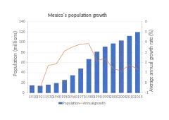 في عام 1900 كان عدد سكان المكسيك 13.6 مليون.[6] ,خلال فترة الازدهار الاقتصادي التي أطلق عليها الاقتصاديون اسم "المعجزة المكسيكية" استثمرت الحكومة في برامج اجتماعية فعالة أدت إلى خفض معدل وفيات الرضع وزيادة متوسط العمر المتوقع، وأدت هذه التدابير مجتمعة إلى زيادة ديموغرافية مكثفة بين عامي 1930 و1980. وأنخفض معدل النمو السنوي للسكان من ذروة 3.5 ٪ في عام 1965 إلى 0.99 ٪ في عام 2005، بينما تنتقل المكسيك الآن إلى المرحلة الثالثة من التحول الديموغرافي وقد كان ما يقرب من 50 ٪ من السكان في عام 2009 يبلغون من العمر 25 عامًا أو أقل.[7] كما انخفضت معدلات الخصوبة من 5.7 طفل لكل امرأة عام 1976 إلى 2.2 عام 2006.[8]
