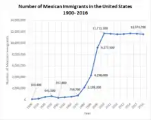 - "Mexican-Born Population Over Time, 1850-Present". Migration Policy Institute. 2013-08-14. مؤرشف من الأصل في 27 نوفمبر 2020. الوسيط