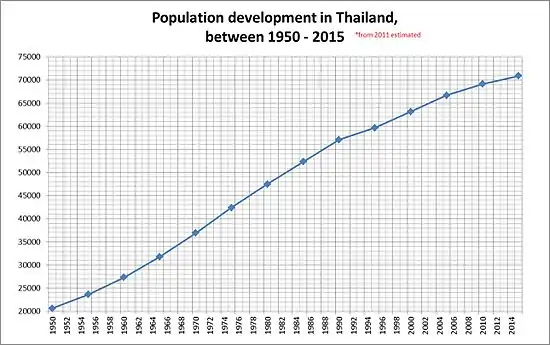 ديموغرافيا تايلاند أو تركيبة سكان تايلاند تتميز تايلاند بسكان متجانسه نسبيا وتغيرات بسبب الهجرة العرقية، يشكل التايلانديون 75% من نسبة السكان والصينيون 14% من السكان و 11% من جماعات مختلفة[1] اللفة الأساسية للسكان هي التايلاندية وتنتشر لغة الملايو بجنوب تايلاند وبعض اللغات مثل الكمبودية والفيتنامية