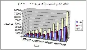 | التطور العددي لسكان مدينة دسوق في الفترة من (1882 - 1986)[6] | |||||||||||||