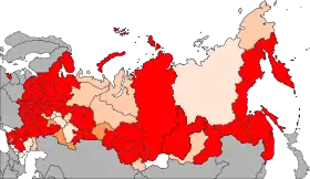 ![]() الناس من أصل روسي نسبة مئوية حسب المنطقة في عام 2010. >80% الناس من أصل روسي نسبة مئوية حسب المنطقة في عام 2010. >80% | |