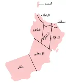 محافظة البريمي : تقع محافظة البريمي على التخوم الشمالية الغربية للسلطنة وتتميز بتنوع تضاريسها الطبيعية بين السهول والجبال والكثبان الرملية والأودية التي تتميز بجريان مياهها العذبة وكانت تسمى أرض الجو أو توأم، وتعتبر بوابة لعمان من جهة الغرب يحدها من الجنوب ولاية عبري ومن الشرق ولايتي صحار وضنك أما من جهة الغرب فتحدها مدينة العين بدولة الإمارات العربية المتحدة. وقد كانت سابقا تعرف بولاية البريمي إلى أن صدر المرسوم السلطاني رقم 108/2006م الصادر 22 من رمضان سنة 1427هـ الموافق 15 من أكتوبر سنة 2006م الذي نص على إنشاء محافظة البريمي، وذلك في إطار الاهتمام السامي بتحقيق المزيد من تنشيط مختلف مجالات التنمية والتطوير التي ترجمها مجلس الوزراء الموقر من خلال إعطاء الأولوية لمحافظة البريمي في مشروعات الخطة الخمسية السابعة (2006-2010) والموافقة على عدد من المشروعات منها في مجال الطرق والكهرباء والخدمات الأخرى إلى جانب الإعداد لإنشاء منطقة صناعية بالبريمي. وتتكون محافظة البريمي من ولايات البريمي ومحضة والسنينة وذلك بعد أن تم رفع المستوى الإداري لنيابة السنينة إلى ولاية بموجب المرسوم السلطاني رقم 107/2006 الصادر في 15/10/2006م، ويصل عدد سكان محافظة البريمي إلى (76.838) نسمة.