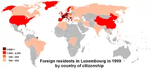 السكان المقيمين الاجانب في لوكسمبورغ في الوقت الراهن أكثر من أرقام 170,700، الموافق 38٪ من مجموع السكان (مقارنة ب 17٪ في 1960s). هؤلاء المهاجرين هم الأغلبية الساحقة من مواطني دول الاتحاد الأوروبي (وهذا يمثل أكثر من 90٪)، وذلك جزء من أكبر بكثير من الذي جاء أصلا من البرتغال وإيطاليا والبلدين الجارين وفرنسا وبلجيكا. منذ بضع سنوات، كان هناك أيضا زيادة كبيرة في عدد المهاجرين وطالبي اللجوء من بلدان أوروبا الشرقية، وخصوصا الجمهوريات الجديدة قد انبثقت من يوغوسلافيا السابقة (البوسنة والهرسك وصربيا والجبل الأسود). هؤلاء المهاجرين تشمل نسبة كبيرة من الشباب. المهاجرين (وخصوصا طالبي اللجوء) يكون لها تأثير قوي على معدل المواليد، وهو ما يمثل ما يقرب من 50٪ من الولادات في لوكسمبورغ.