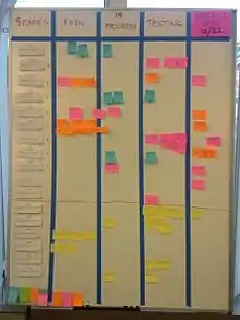 لتوضيح كل مرحلة من مراحل العمل، فان الفرق التي تعمل في نفس المساحة غالبا ما تستخدم post-it notes ملاحظات تنبيهية علي لوحة بيضاء كبيرة.