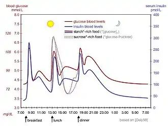 كما نرى في الشكل بتناول طعام أو حلويات يرتفع مستوى الجلوكوز في الدم ثم يهبط تحت مفعول الإنسولين ، حيث يوجهه إنزيم الإنسولين ليدخل خلايا الجسم لكي يستفيد من السكر. ثم يتناول المرء طعام الغداء فيرتفع مستوى السكر في الدم مرة ثانية، فيفرز البنكرياس الإنسولين في الدم فيقوم بتوزيع الجلوكوز على خلايا الجسم . ثم وجبة العشاء وقد تتكون من الخبز وعسل النحل والجبن ؛ هنا أيضا يرتفع مستوى الجلوكوز في الدم، فيأتي الإنسولين لتوزيعه على الخلايا، فالجلوكوز هو المصدر الأول لها للحصول على الطاقة.