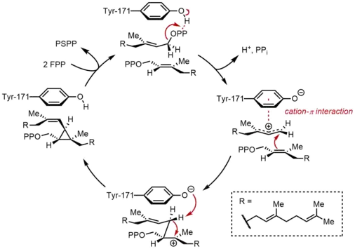 في النصف الأول من التفاعل، يرتبط جزيئين متطابقين من إلى سينزاس سكوالين (SQS) بطريقة متسلسلة. ترتبط جزيئات الـ FPP بمناطق متميزة من الإنزيم، ولها ارتباطات ملزمة مختلفة.[11] بدءا من الجزء العلوي من الدورة الحفازة أدناه، يبدأ التفاعل مع تأين FPP لتوليدكاتيون كاربوني . وتلعب بقايا التيروزين (Tyr-171) دورًا حاسمًا في هذه الخطوة من خلال العمل كمانح للبروتونات لتسهيل استخراج البيروفوسفات. علاوة على ذلك، فإن الأنيون الفينول الناتج يمكن أن يساعد على استقرار الكرب الناتجة عن طريق تفاعلات باي - كاتيون، والتي ستكون قوية بشكل خاص بسبب طبيعتها الغنية جدا بالإلكترون من الأنيون الفينول. ثم يتم الهجوم على الكاتيون الأليكلي الناتج عن أولفين من جزيء ثانٍ من FPP ، مما يوفر ارتباطًا كهربيًا ثالثًا. إن الأنيون الفينول الذي تم إنشاؤه من قبل يعمل كقاعدة لتجريد بروتون من هذا المعقد لتشكيل منتج بروبان حلقي، بروسكولين بيروفوسفات (PSPP). PSPP تم إنشاؤه لا يزال مرتبطا مع SQS للتفاعل الثاني.[5][10] تم إثبات أهمية وجود بقايا التيروزين في هذه العملية من خلال دراسات الطفرات على الفئران SQS (rSQS) ، [7] وحقيقة أن Tyr-171 محفوظ في جميع SQSs المعروفة (و PHSs).[2] في rSQS ، تم تحويل Tyr-171 إلى بقايا عطرية فينيل انالين وتريبتوفان، وكذلك مخلفات تحتوي على الهيدروكسيل سيرين (حمض اميني). لم يتمكن أي من هذه المسوخات من تحويل FPP إلى PSPP أو السكوالين، مما يدل على أن الحلقات العطرية أو الكحولات وحدها غير كافية لتحويل FPP إلى PSPP.