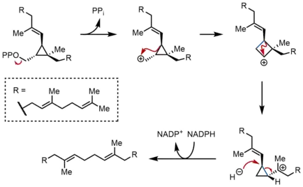 13. Jarstfer, Michael B.; Blagg, Brian S. J.; Rogers, Daniel H.; Poulter, C. Dale (1996-12-25). "Biosynthesis of Squalene. Evidence for a Tertiary Cyclopropylcarbinyl Cationic Intermediate in the Rearrangement of Presqualene Diphosphate to Squalene". Journal of the American Chemical Society (باللغة الإنجليزية). 118 (51): 13089–13090. doi:10.1021/ja963308s. مؤرشف من الأصل في 10 يناير 2020. الوسيط |CitationClass= تم تجاهله (مساعدة)