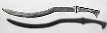 وتتمثل كيفية صياغة المعدن البرونزي في تسخين المعدن، ثم طرقه حتى يظهر بالشكل المرغوب، مع تبريده بسرعة في ذات الوقت. وتُعد تلك الأسلحة البرونزية أفضل من الأسلحة الحجرية من نفس النوع، بالرغم من أنها أكثر صعوبة في صنعها وإتمامها. وقد تم اتباع نفس الخطوات الأساسية إلى حدٍ كبير في التعامل مع الحديد في ذلك العصر. وأثبت الحديد قوة أكثر من البرونز، وربما قوة تحمل أكثر، مما جعله الاختيار الأنسب ضمن المعادن في السنوات الأخيرة. على الجانب الأيمن توجد صورة لسيف برونزي على شكل منجل وقوس حديدي
